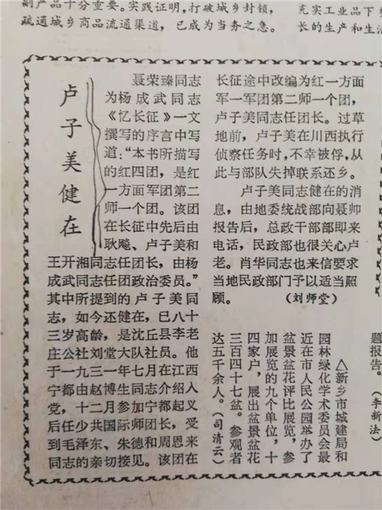 1982年,當年盧子美的入黨介紹人、時任民政部副部長袁血卒在一份報告中寫到一個細節:盧子美第一次病危,已經不能回答記者的問話。他的孫媳婦一旁插話說,“俺爺的心事,就是想到共產黨”,盧子美這時睜開眼流著淚花,點點頭。