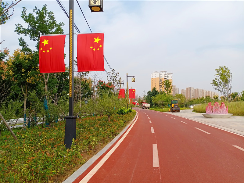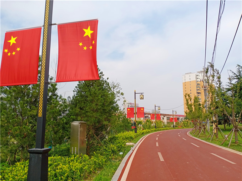 10月3日,國慶假期的第三天,記者在周口市中心城區中州大道橋與周口大道橋之間的沙潁河北岸的河堤(潁河路)上看到,街道邊懸掛著鮮艷的五星紅旗,給節日里的周口增添一抹喜慶色彩,讓市民在游玩欣賞沙潁河迷人風景的同時,感受濃厚的節日氣氛。③6