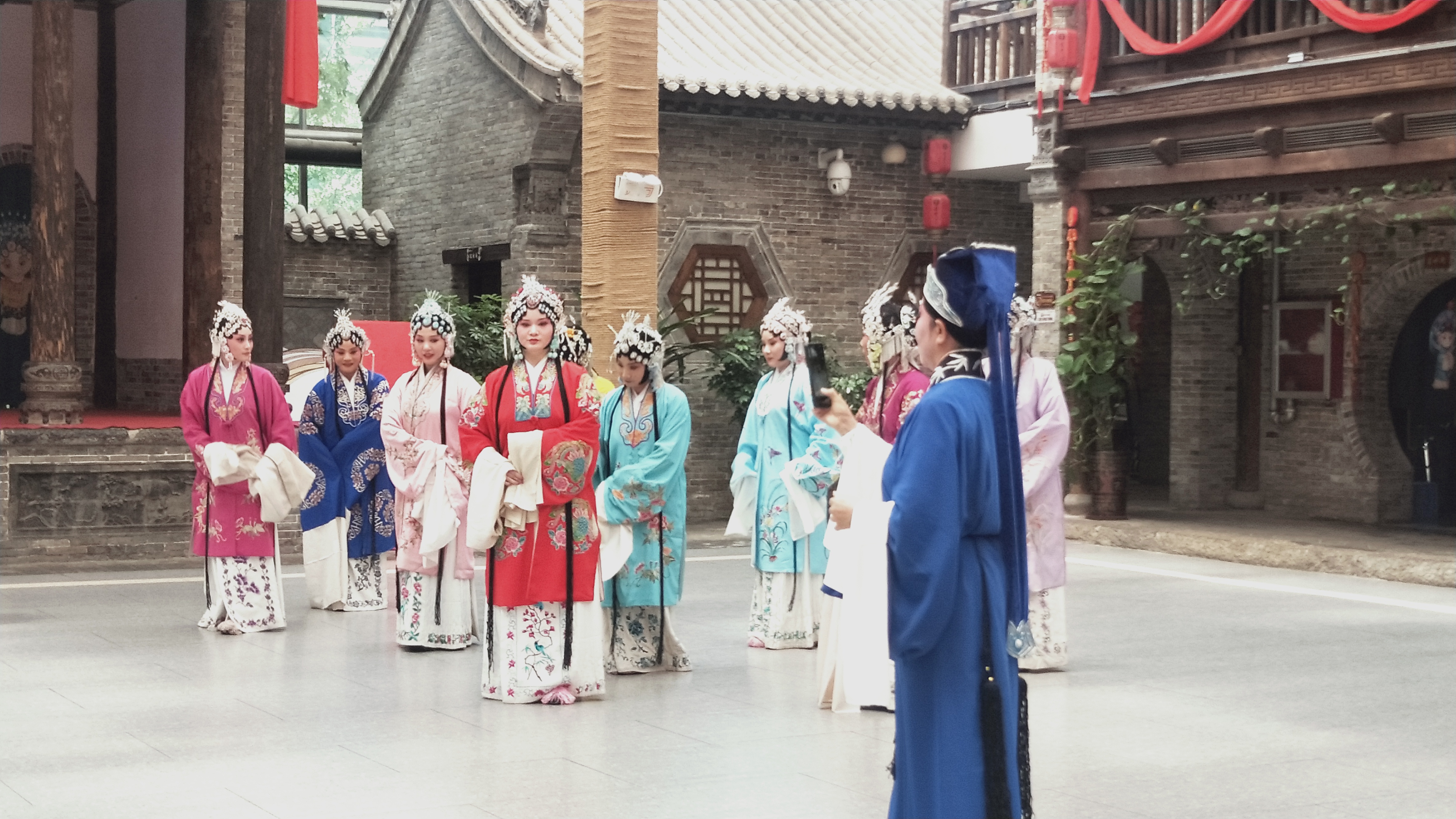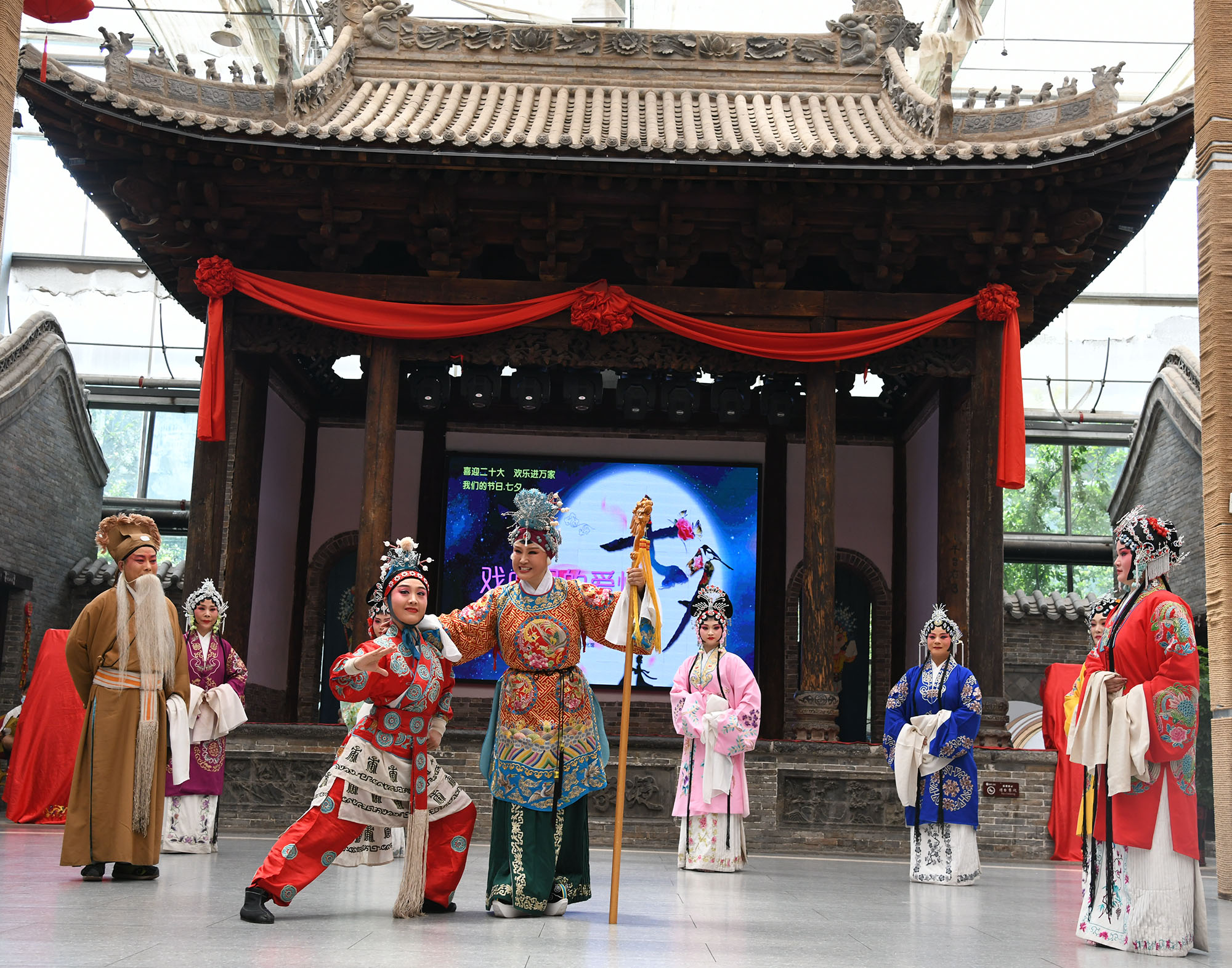 ?8月3日上午,市豫劇團團長、戲劇藝術家肖秀蓮帶領演員們在建業大食堂演出《五世請纓》中的《一家人歡天喜地》一折。