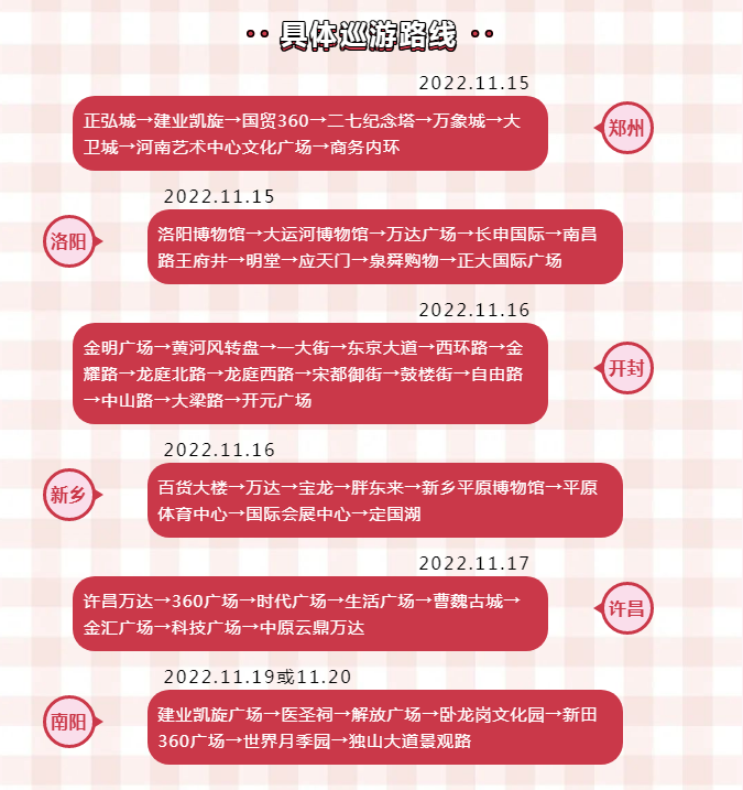巡游活動將會陸續在開封、洛陽、新鄉、許昌、南陽五市展開,途經各個地市商圈及市中心地帶,馬上參考我們下方的路線,追著我們的車隊一起跑起來吧!