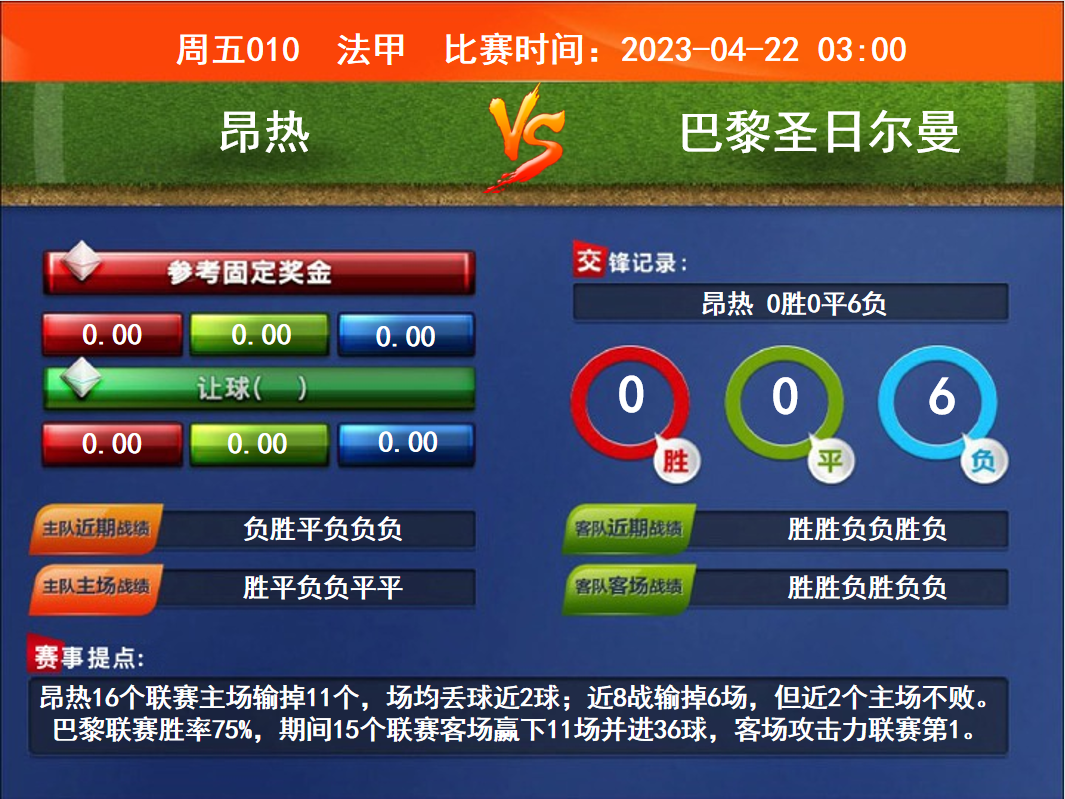 比賽時間:2023-04-22 03:00賽事提點:昂熱16個聯賽主場輸掉11個,場均丟球近2球;近8戰輸掉6場,但近2個主場不敗。巴黎聯賽勝率75%,期間15個聯賽客場贏下11場并進36球,客場攻擊力聯賽第1。