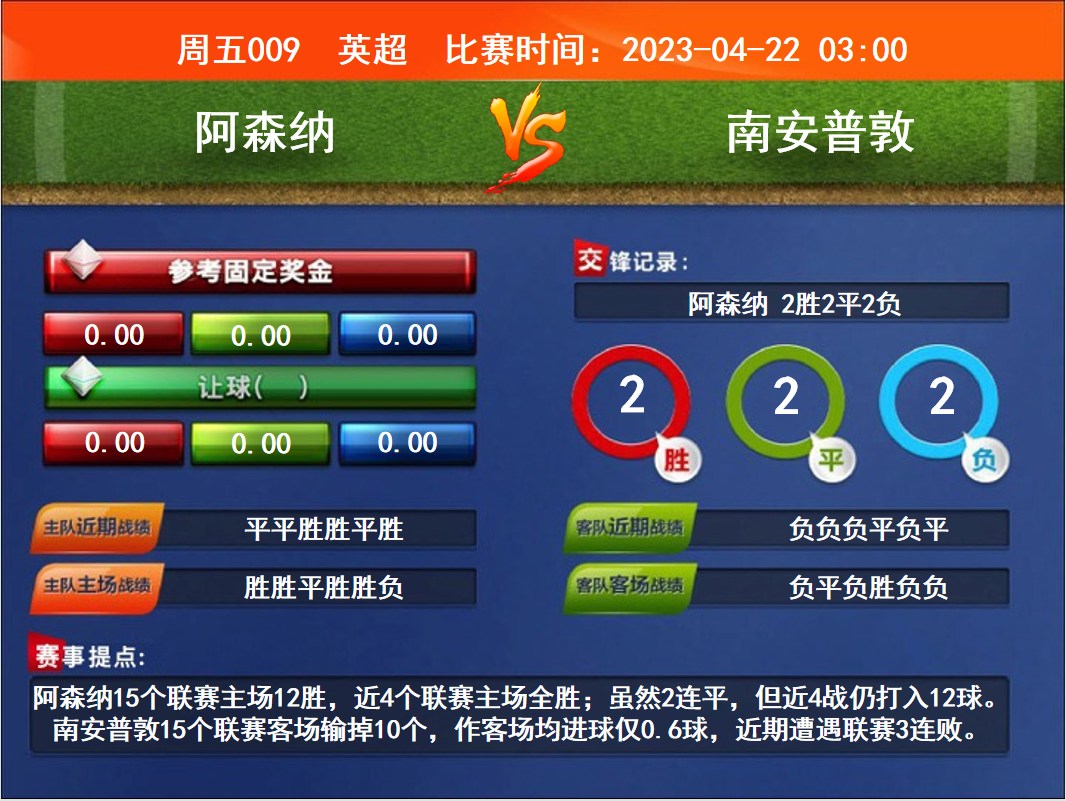 比賽時間:2023-04-22 03:00賽事提點:阿森納15個聯賽主場12勝,近4個聯賽主場全勝;雖然2連平,但近4戰仍打入12球。南安普敦15個聯賽客場輸掉10個,作客場均進球僅0.6球,近期遭遇聯賽3連敗。