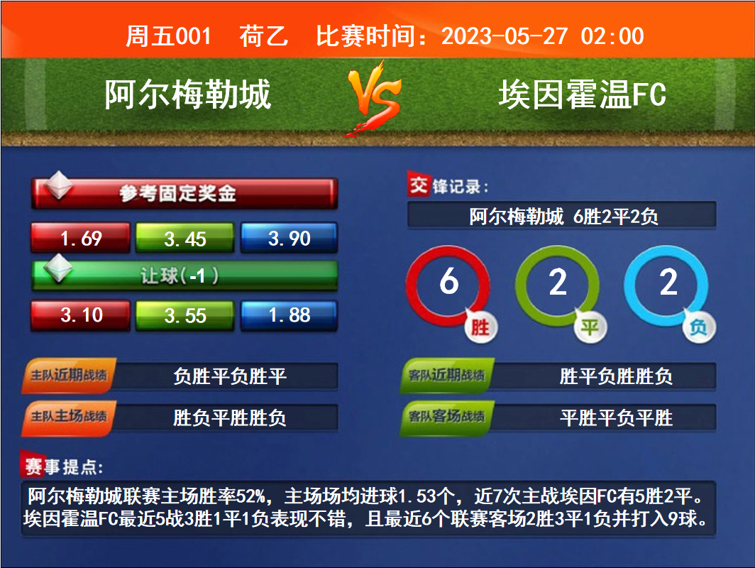 比賽時間:2023-05-27 02:00賽事提點:阿爾梅勒城聯賽主場勝率52%,主場場均進球1.53個,近7次主戰埃因FC有5勝2平。埃因霍溫FC最近5戰3勝1平1負表現不錯,且最近6個聯賽客場2勝3平1負并打入9球。