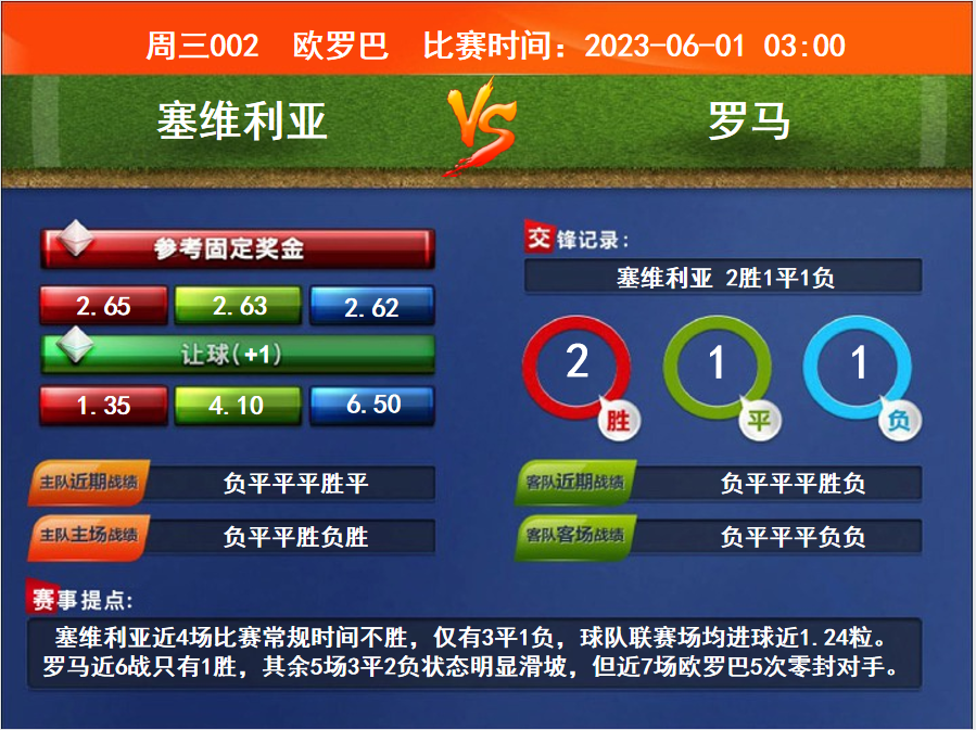 比賽時間:2023-06-01 03:00賽事提點:塞維利亞近4場比賽常規時間不勝,僅有3平1負,球隊聯賽場均進球近1.24粒。羅馬近6戰只有1勝,其余5場3平2負狀態明顯滑坡,但近7場歐羅巴5次零封對手。