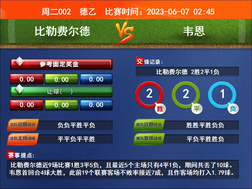 賽事提點:比勒費爾德近9場比賽1勝3平5負,且最近5個主場只有4平1負,期間共丟了10球。韋恩首回合4球大勝,此前19個聯賽客場不敗率接近7成,且作客場均打入1.79球。