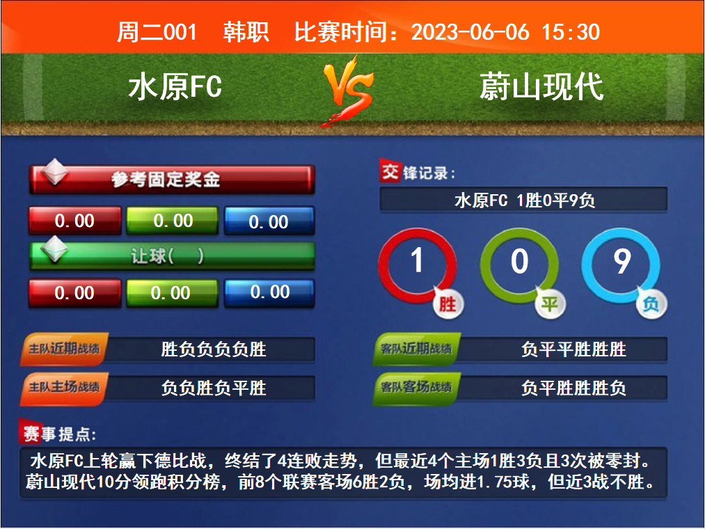 比賽時間:2023-06-06 15:30賽事提點:水原FC上輪贏下德比戰,終結了4連敗走勢,但最近4個主場1勝3負且3次被零封。蔚山現代10分領跑積分榜,前8個聯賽客場6勝2負,場均進1.75球,但近3戰不勝。