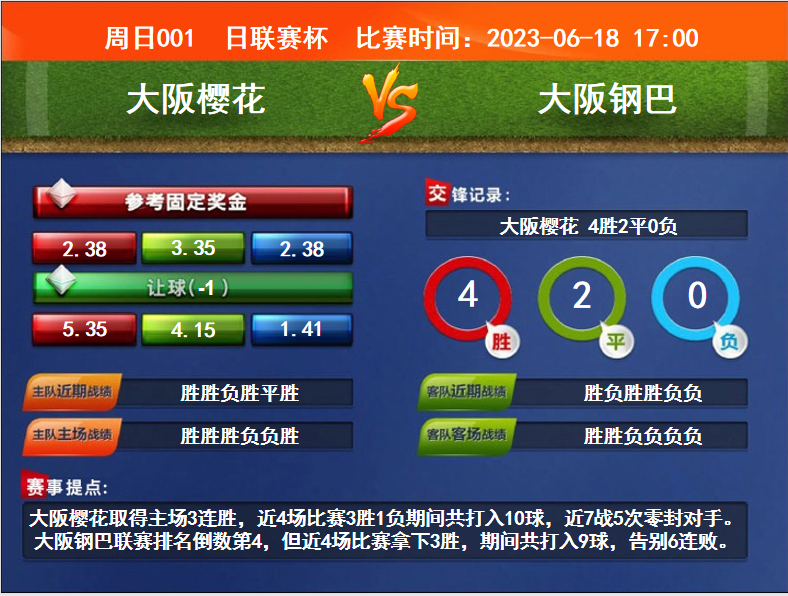 比賽時間:2023-06-18 17:00賽事提點:大阪櫻花取得主場3連勝,近4場比賽3勝1負期間共打入10球,近7戰5次零封對手。大阪鋼巴聯賽排名倒數第4,但近4場比賽拿下3勝,期間共打入9球,告別6連敗。