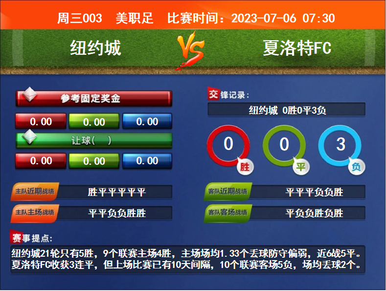 比賽時間:2023-07-06 07:30賽事提點:紐約城21輪只有5勝,9個聯賽主場4勝,主場場均1.33個丟球防守偏弱,近6戰5平。夏洛特FC收獲3連平,但上場比賽已有10天間隔,10個聯賽客場5負,場均丟球2個。