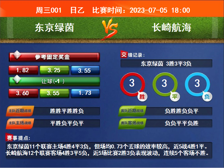 比賽時間:2023-07-05 18:00賽事提點:東京綠茵11個聯賽主場4勝4平3負,但場均0.73個丟球的效率較高,近5戰4勝1平。長崎航海12個聯賽客場4勝3平5負,近5場比賽2勝3負表現波動,連續5個客場不勝。