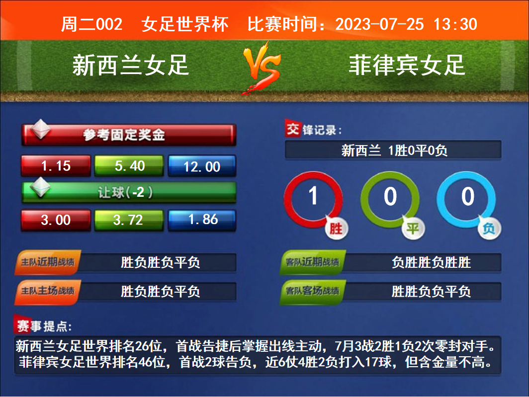 比賽時間:2023-07-25 13:30賽事提點:新西蘭女足世界排名26位,首戰告捷后掌握出線主動,7月3戰2勝1負2次零封對手。菲律賓女足世界排名46位,首戰2球告負,近6仗4勝2負打入17球,但含金量不高。