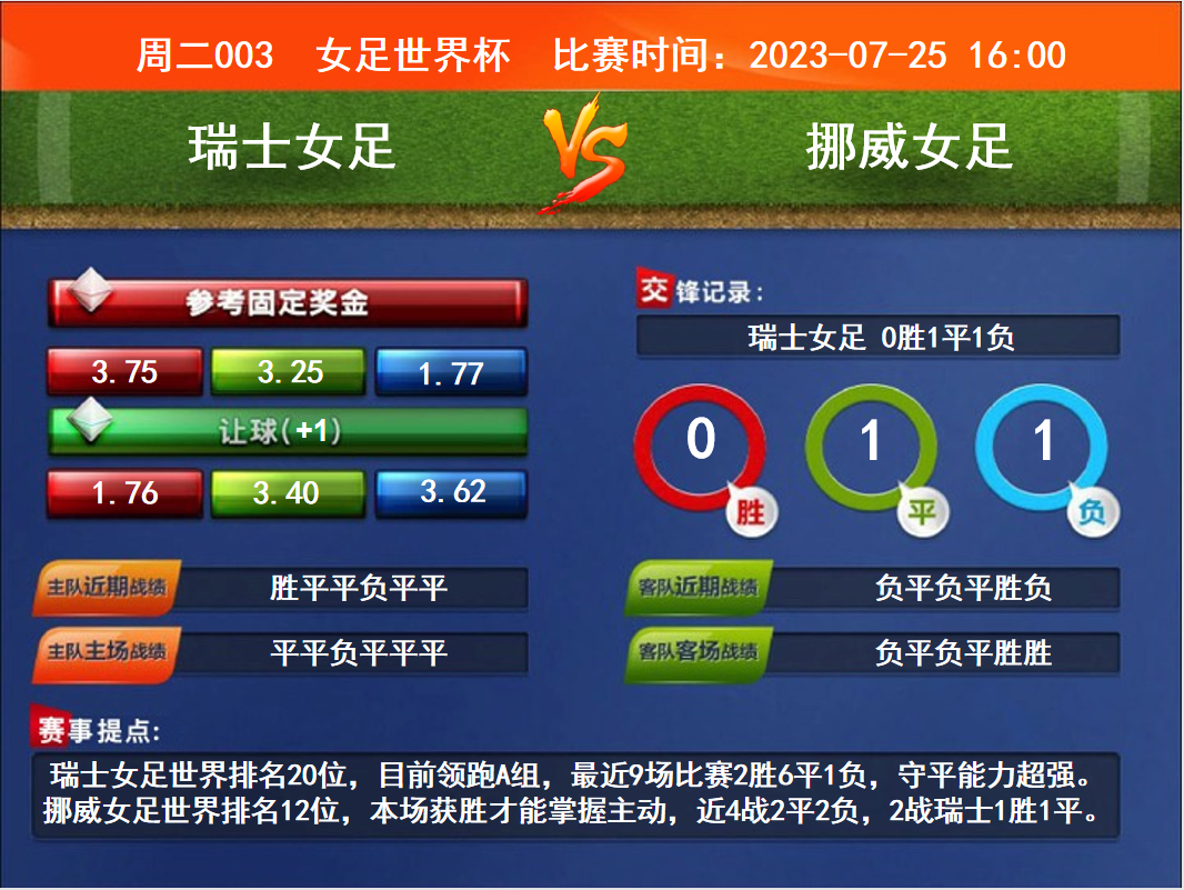 比賽時間:2023-07-25 16:00賽事提點:瑞士女足世界排名20位,目前領跑A組,最近9場比賽2勝6平1負,守平能力超強。挪威女足世界排名12位,本場獲勝才能掌握主動,近4戰2平2負,2戰瑞士1勝1平。
