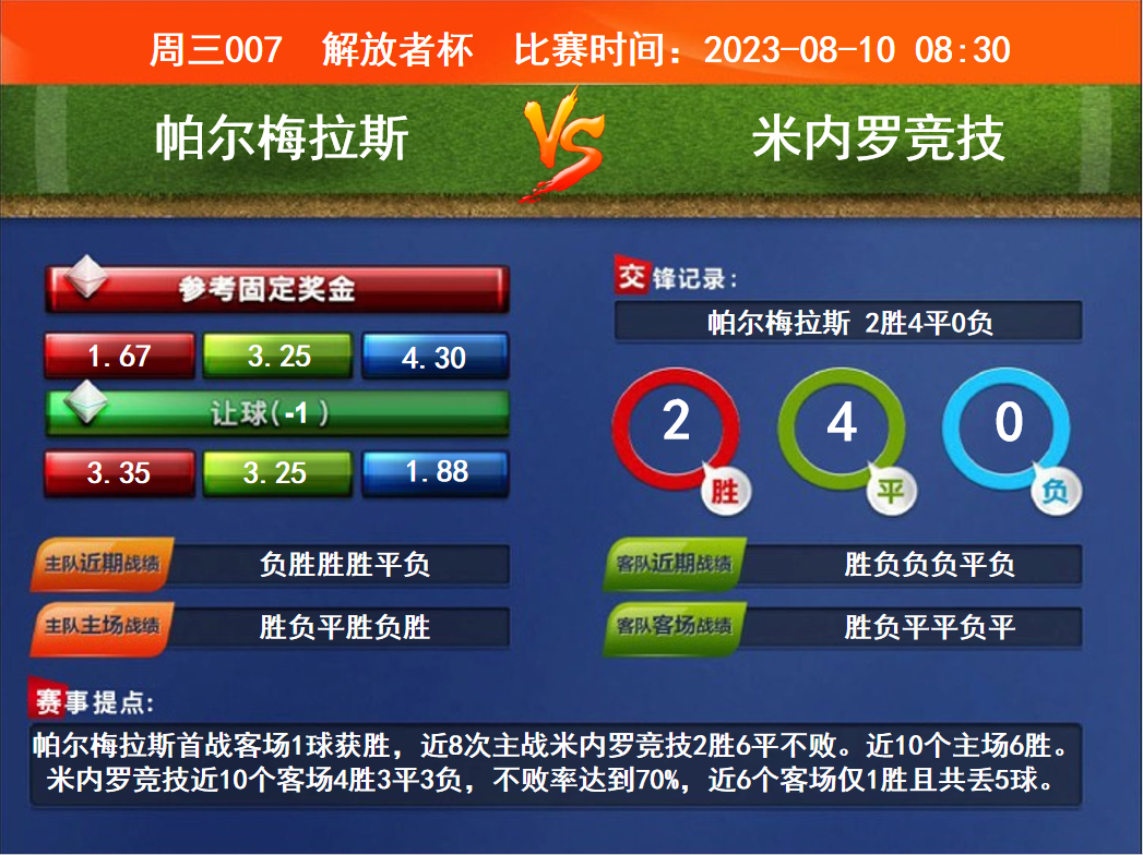 比賽時間:2023-08-10 08:30賽事提點:帕爾梅拉斯首戰客場1球獲勝,近8次主戰米內羅競技2勝6平不敗。近10個主場6勝。米內羅競技近10個客場4勝3平3負,不敗率達到70%,近6個客場僅1勝且共丟5球。