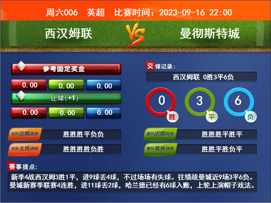 比賽時間:2023-09-16 22:00賽事提點:新季4戰西漢姆3勝1平,進9球丟4球,不過場場有失球。往績戰曼城近9場3平6負。曼城新賽季聯賽4連勝,進11球丟2球,哈蘭德已經有6球入賬,上輪上演帽子戲法。