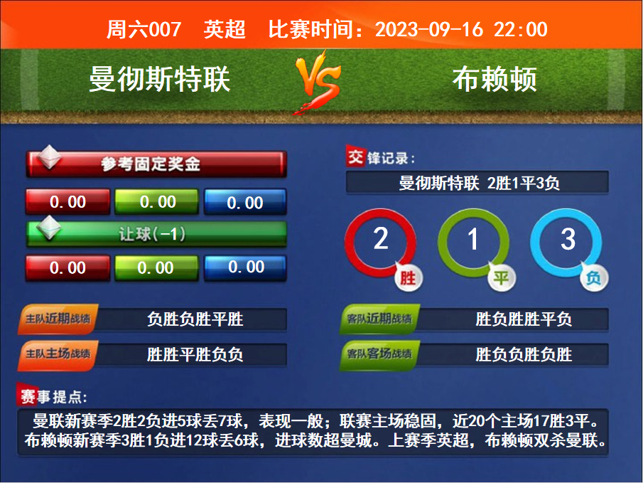 比賽時間:2023-09-16 22:00賽事提點:曼聯新賽季2勝2負進5球丟7球,表現一般;聯賽主場穩固,近20個主場17勝3平。布賴頓新賽季3勝1負進12球丟6球,進球數超曼城。上賽季英超,布賴頓雙殺曼聯。