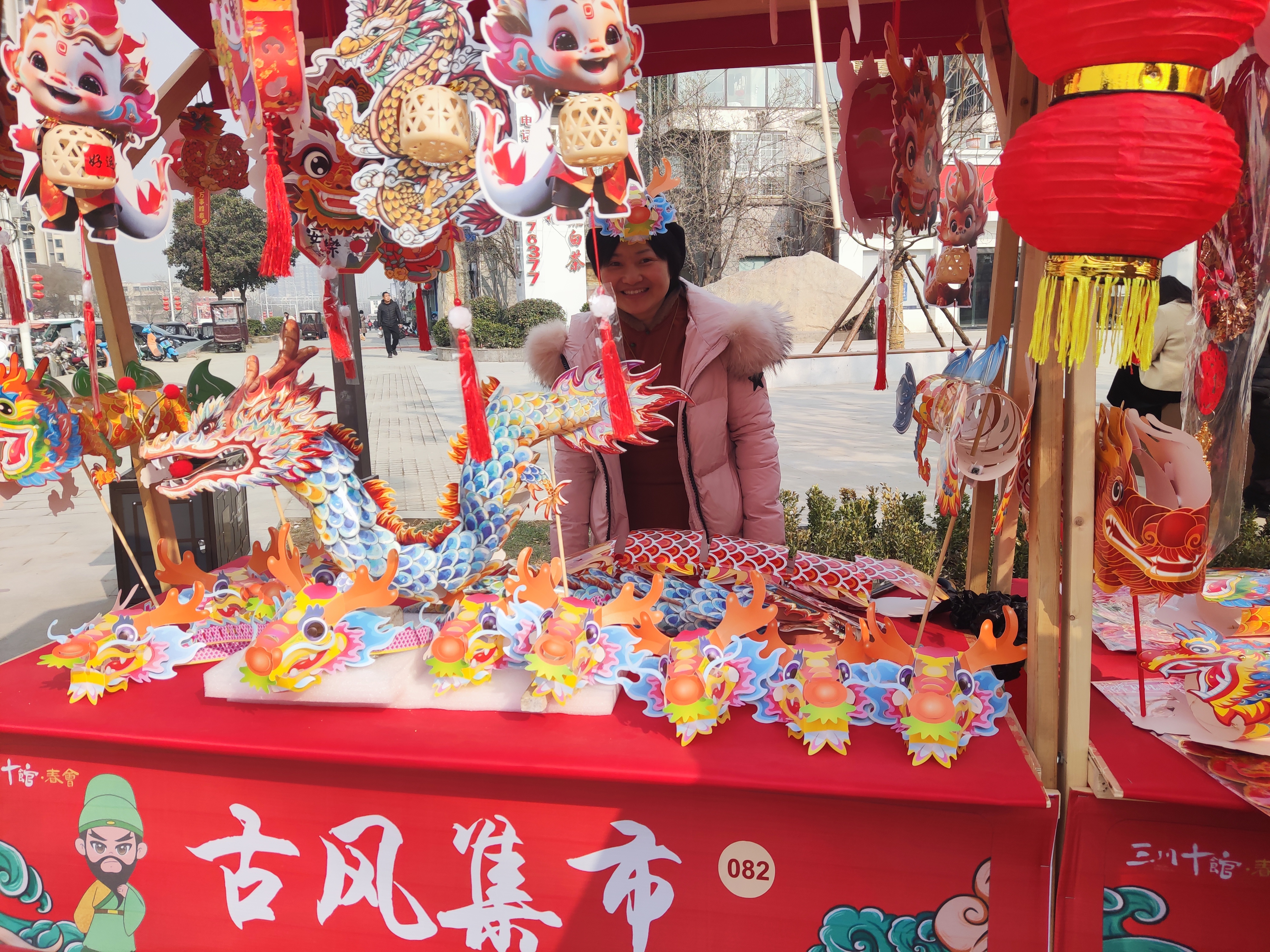 2月12日,關帝廟歷史街區的“古風集市”上,人來人往、熙熙攘攘,布老虎、泥泥狗、剪紙、糖人等具有周口特色的非遺產品烘托出濃濃的年味,吸引大量游客前來欣賞、購買。