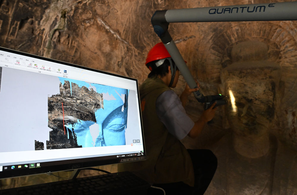 2025年4月9日,武漢大學文化遺產智能計算實驗室團隊成員在魏字洞使用關節臂掃描儀對佛像進行數字化掃描。圖片來源新華社