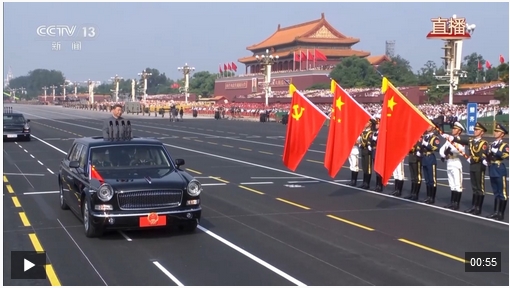 偉大旗幟光耀千秋。中國共產(chǎn)黨黨旗、中華人民共和國國旗、中國人民解放軍軍旗在受閱部隊最前方迎風招展。檢閱車行進至黨旗、國旗、軍旗前,敬禮號角響起,習近平停車肅立,以注目禮向三面旗幟莊嚴致敬。