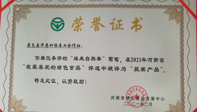[鹿邑]“緣來自然果”葡萄喜獲2021年河南省“我最喜愛的綠色食品”殊榮