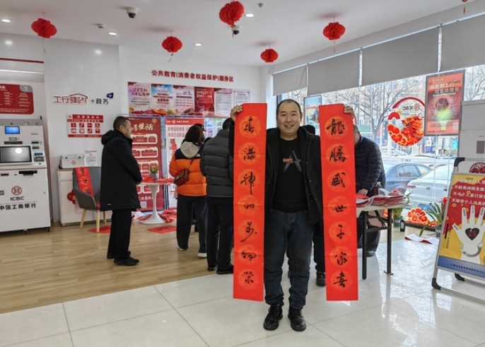 新春佳節來臨之際,工行周口分行傳承中華民族習俗,積極營造歡樂祥和吉慶的節日氛圍,精心組織本行書法家和書法愛好者在營業網點開展“寫春聯送福字賀新年”活動,為廣大群眾送上新春美好祝福。