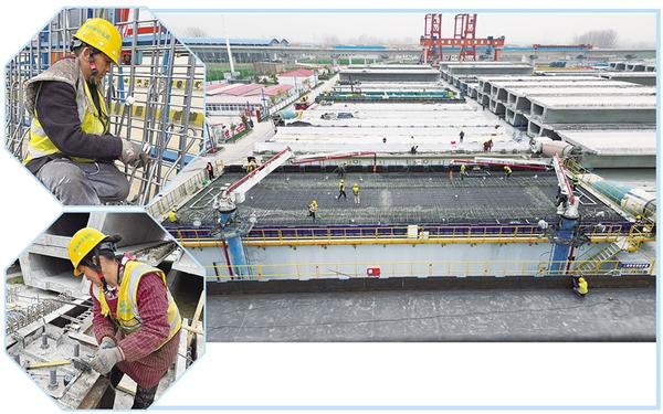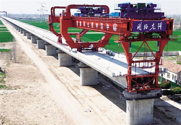 3月17日上午,中鐵七局的工人正在緊張施工。目前,平漯周高鐵項目快速推進,周口境內商周特大橋跨河流、國道、高速等連續梁施工進入加班加點搶工期階段,樁基、承臺、墩身施工接近尾聲,已鋪架箱梁90榀。