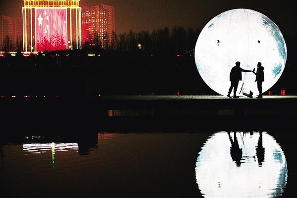 1月18日晚,兩名青年站在引黃調蓄湖邊的“月亮”前開心地唱歌,表達對新年的期盼之情。