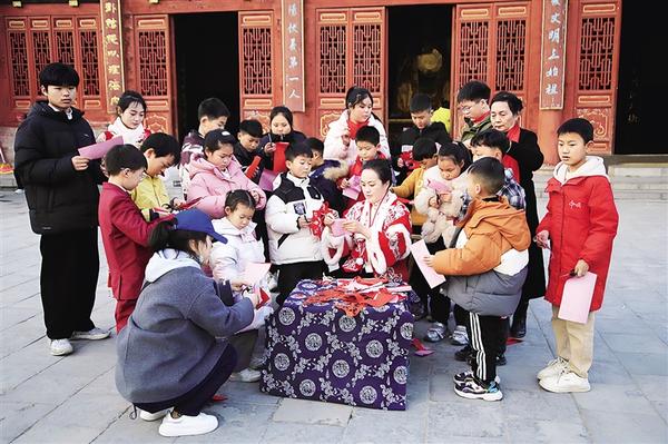 近日,在淮陽太昊陵統天殿前,非遺剪紙傳承人張玉林身著傳統服裝,帶領孩子們一起剪紙。