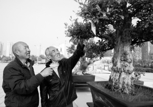 兩名老人在市體育場“市第四屆花卉盆景藝術展”上駐足觀看。(記者 沈湛 攝)