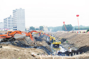 5月14日以來,在新一屆縣委的統一部署下,經過廣大干群的共同努力,城區風景河、護城河、閆溝河、鹿辛運河、急三道河,五河河流集中整治取得了顯著成效。圖為城區急三道河第二階段清淤、雨污分離工作正在緊鑼密鼓地進行。(閆子健 攝)