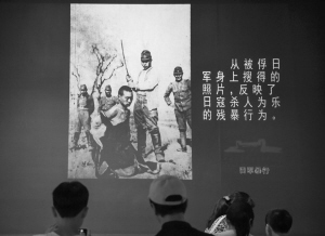 日軍虐待和殘殺戰俘的罪行,也展示在主題展覽中。有一組照片來自美國《生活》雜志,照片顯示日軍軍官先用劍刺殺一名中國戰俘,隨后,日軍士兵用刺刀繼續進行“刺殺練習”,其殘忍和野蠻令人發指。