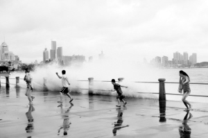 7月12日,人們躲避青島海邊巨浪。 新華社發