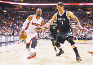 當地時間3月11日,熱火隊球員韋德(左)帶球突破網隊球員洛佩斯的防守。當日,在2014—2015賽季NBA常規賽中,邁阿密熱火隊主場以104∶98戰勝布魯克林網隊。